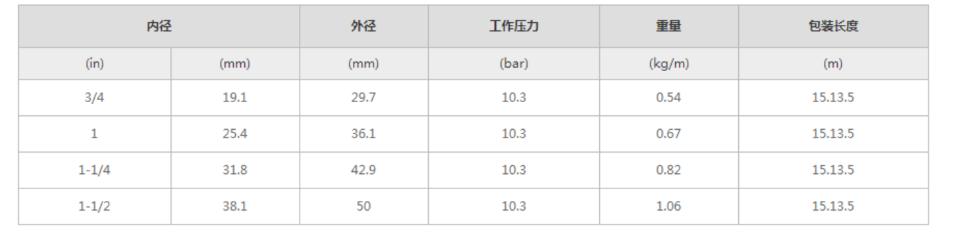 內膠:黑色的以三元乙丙為基膠的合成橡膠VERSIGADE。外膠:藍色的三元乙丙橡膠。增強層:兩層FLEXTEN纖維纏繞層,FLEXTEN是防彈纖維。溫度:-40℉~300℉(-40℃~149℃)顏色:藍色內徑外徑工作壓力包裝重量inmminmmpsiMpaFT/ReelKg/m7/822.23115/1649.211501.0330.32125.40123/6434.531501.033