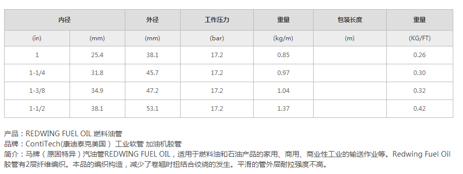 用途:適用于燃料油和石油產品的家用、商用、商業(yè)性工業(yè)的輸送作業(yè)等。Redwing Fuel Oil膠管有2層纖維編織。本品的編織構造,減少了卷翹時扭結合絞繞的發(fā)生。平滑的管外層耐拉強度不高。