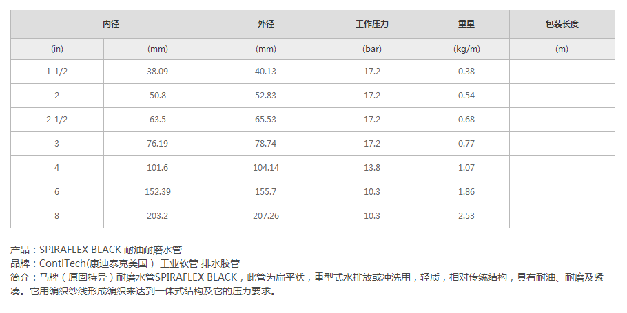 內(nèi)膠:黑色的WEATHEREX。外膠:灰色的以三元乙丙為基膠的合成橡膠VERSIGARD。增強(qiáng)層:多層合成纖維纏繞層。溫度:-30℉~220℉(-34℃~140℃)顏色:灰色內(nèi)徑外徑工作壓力包裝重量inmminmmpsiMpaFT/Reelkg/m250.8235/6464.691501.031001.7121/263.533/6477.391501.031002.07376.2337/6490.8