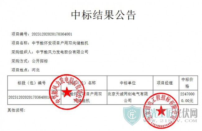 儲能 | 0.749元/Wh!天誠同創(chuàng)中標(biāo)中節(jié)能河北懷安戶用15MW/30MW雙向儲能機(jī)采購項目